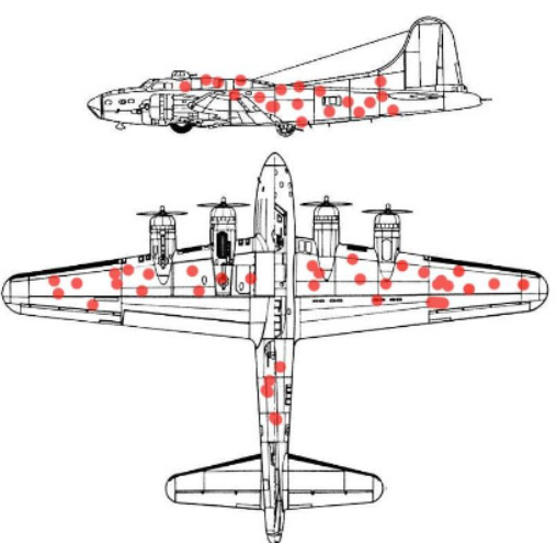 그 시절의 통계 리서치 그룹(SRG)은 살아 돌아온 전투기를 조사해 총알 자국이 집중된 곳에 장갑을 덧대야 한다고 판단했다.